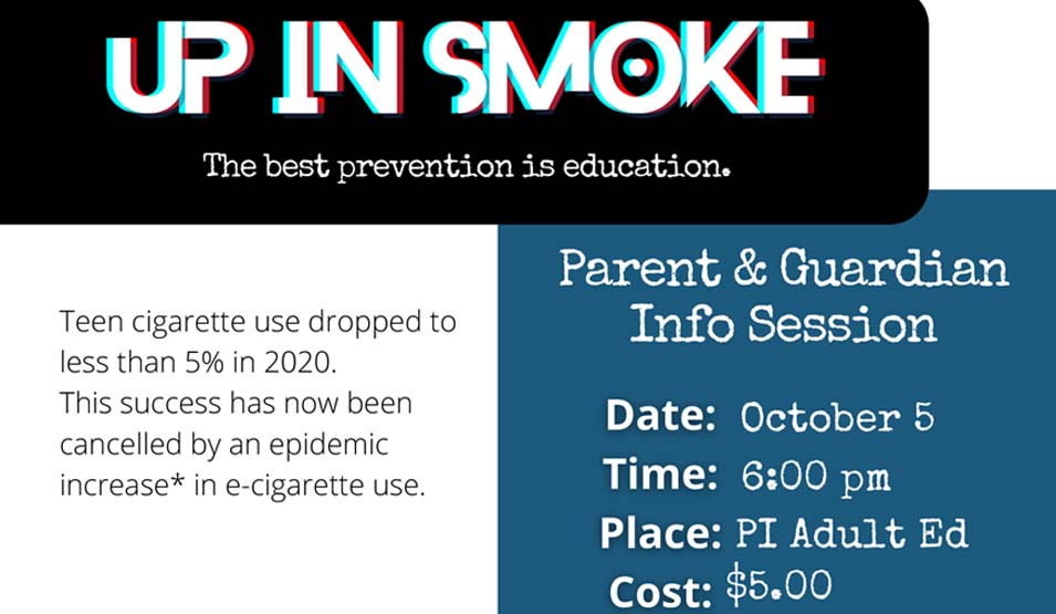ACAP will be partnering with MSAD 1 Adult and Community Education for a community presentation on e-cigarettes titled Up in Smoke on October 5th at 6:00 pm. Up in Smoke is a presentation filled with valuable information designed to provide adults in the lives of County youth with the tools they need to know the truths about these devices, conversation starters and resources to help.